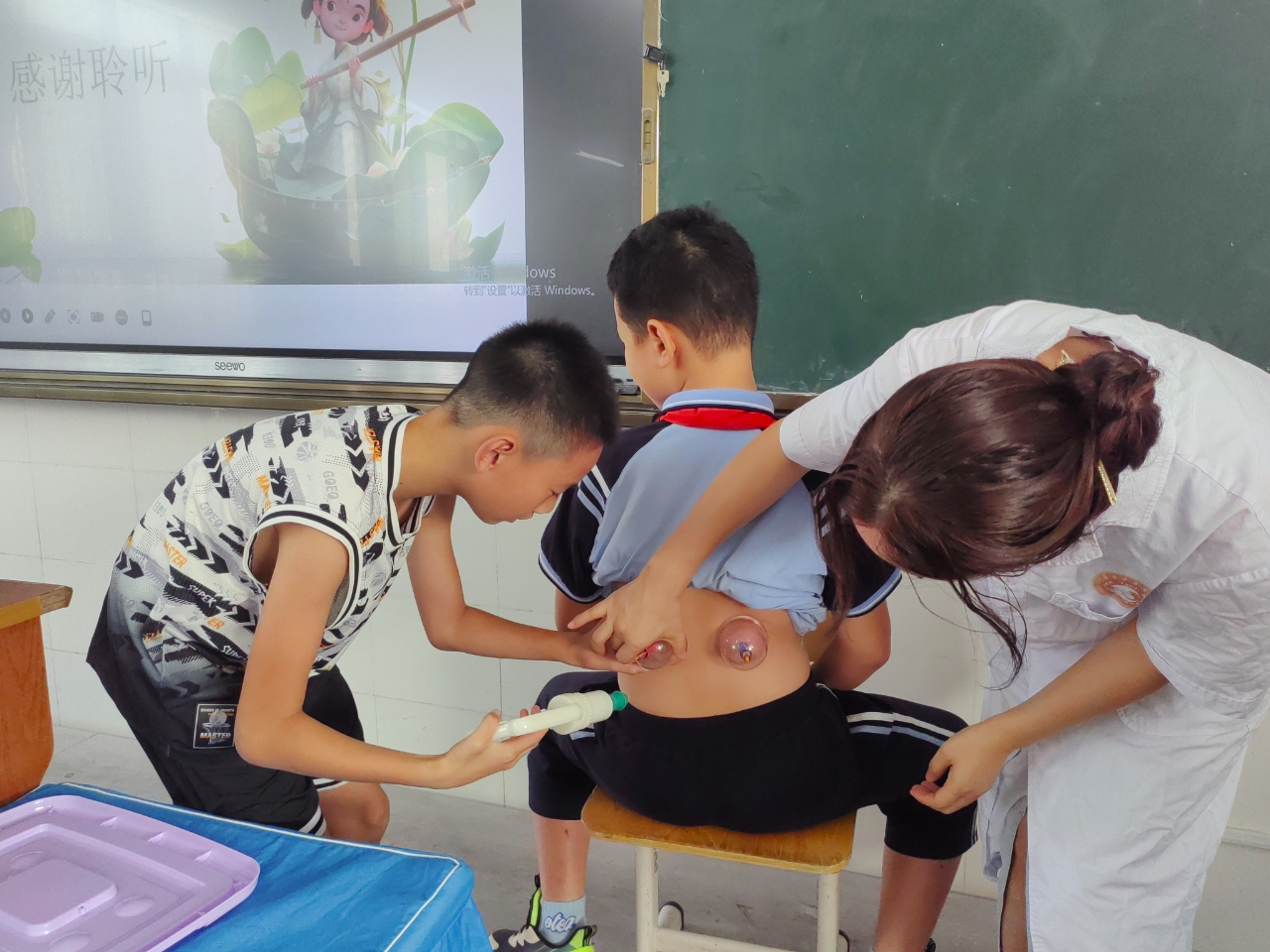 让师生们通过学习中医药文化,了解中医药防病治病的优势,易老师现场为大家演示拔罐技术,让现场小朋友亲身体验一下拔罐的操作技术,大家都非常踊跃参与。
