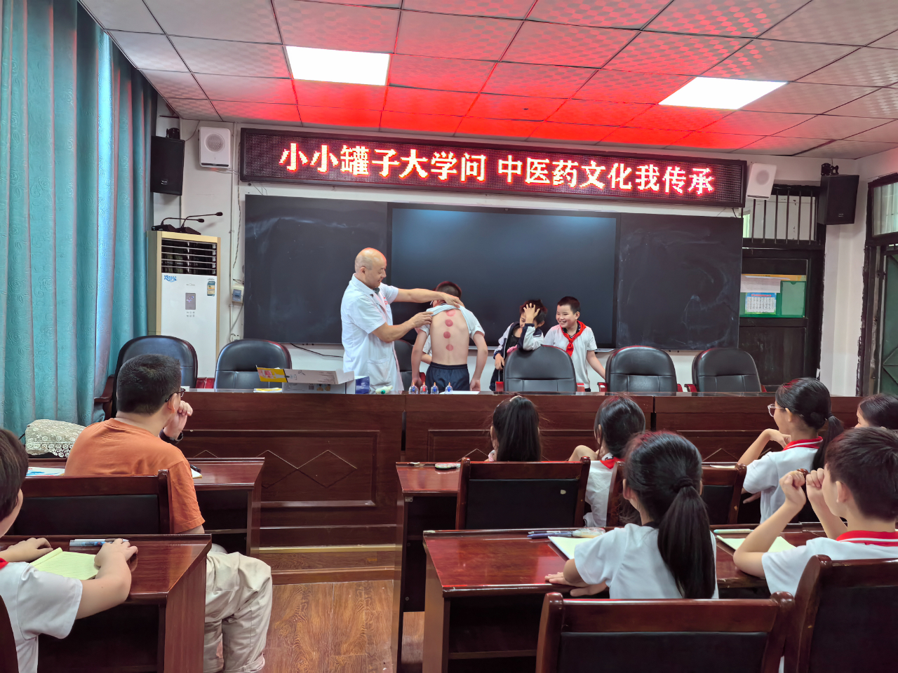 活动第一环节百节镇中心卫生院中医夏先文医生走进中心学校,开展“小小罐子大学问 中医药文化我传承”健康宣传教育活动。在授课环节,夏老师以巴黎奥运会运动员后背上“神秘的东方力量”为由头,深入浅出地从中医拔罐疗法的起源、发展、理论基础和临床应用等方面进行了系统讲解,并介绍拔罐的操作方法和注意事项。