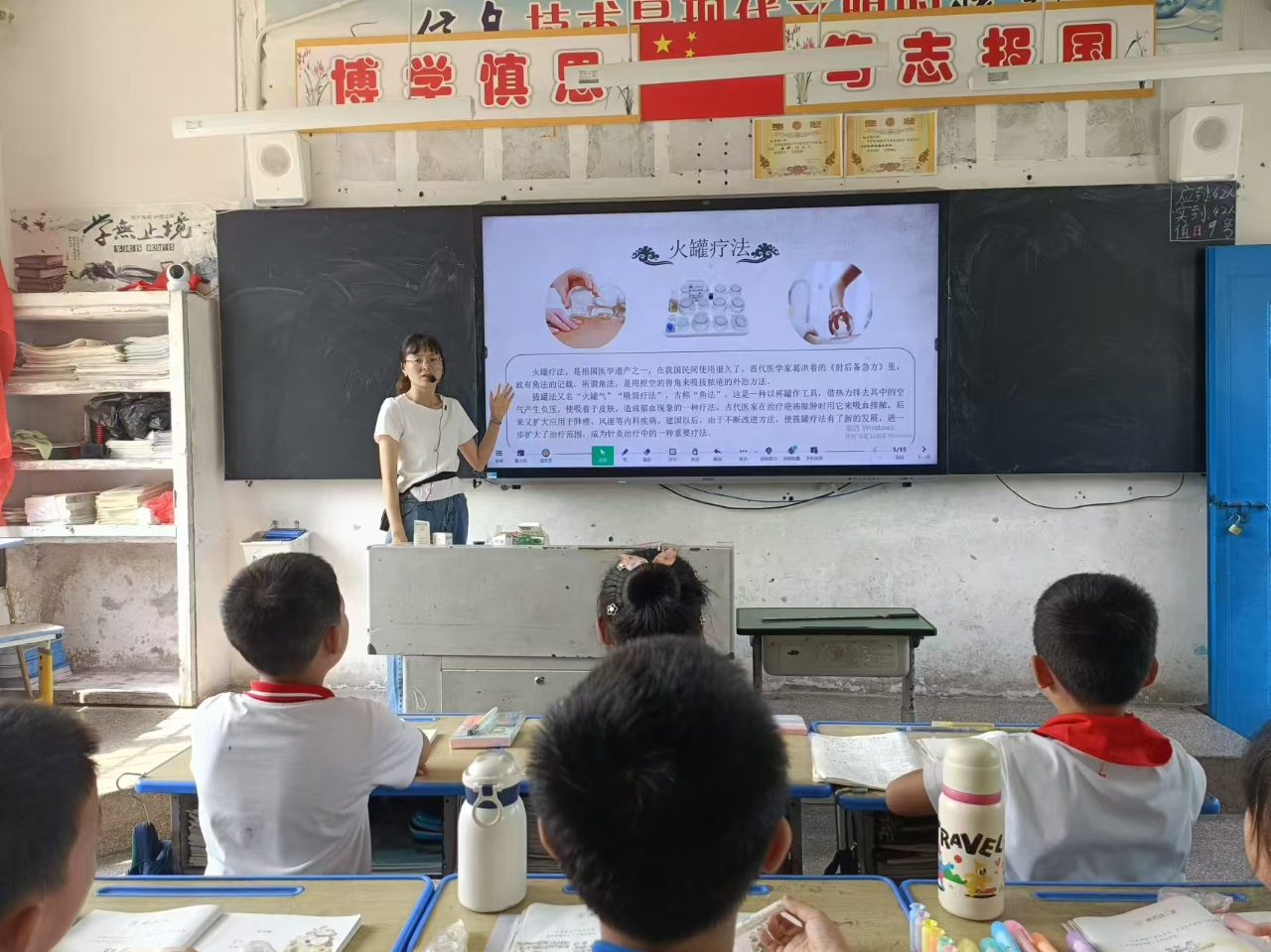 活动第二环节,全校分班开展了“小小罐子大学问 中医药文化我传承”主题班会,老师们通过动主题班会的形式给学生们介绍拔罐的起源、历史发展、种类,以及原理、功效等,并指导同学们拔罐、走罐的操作流程。