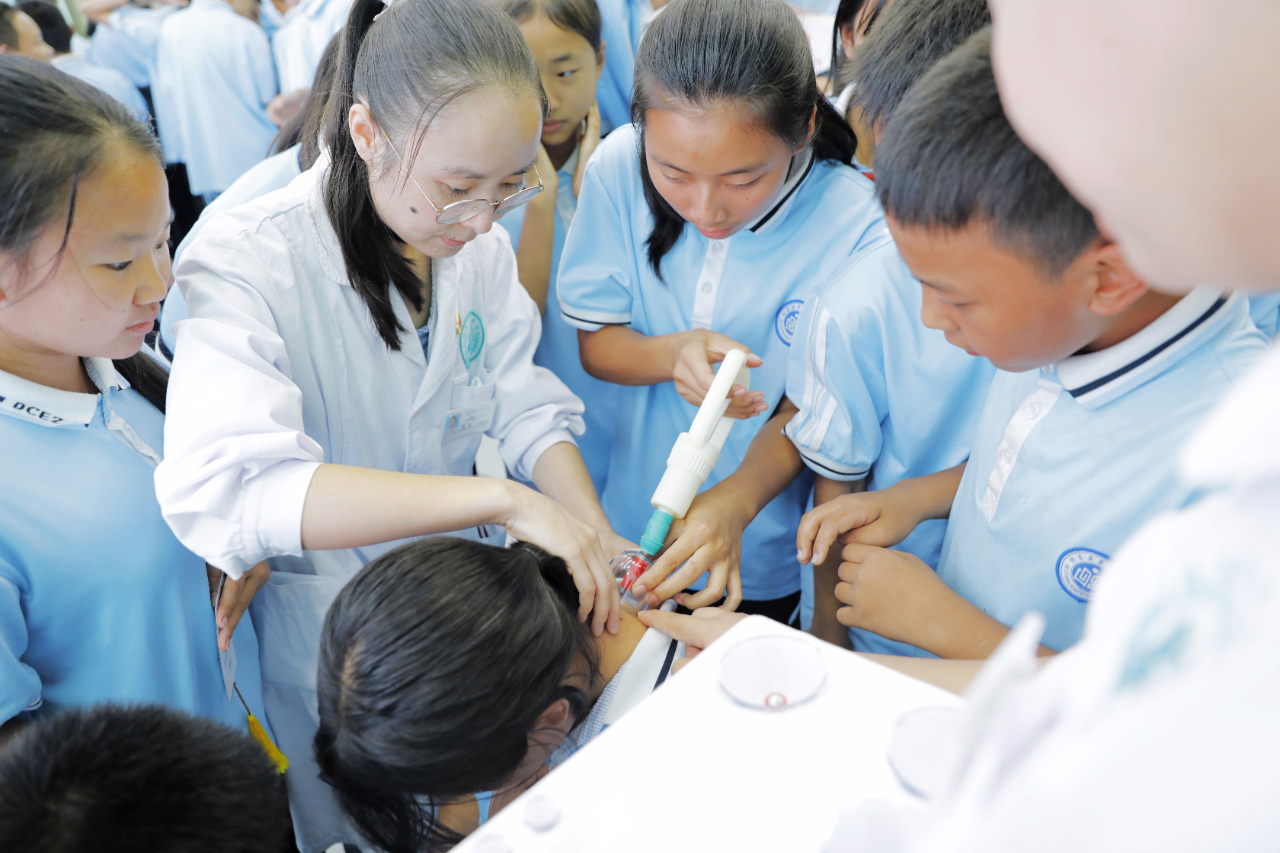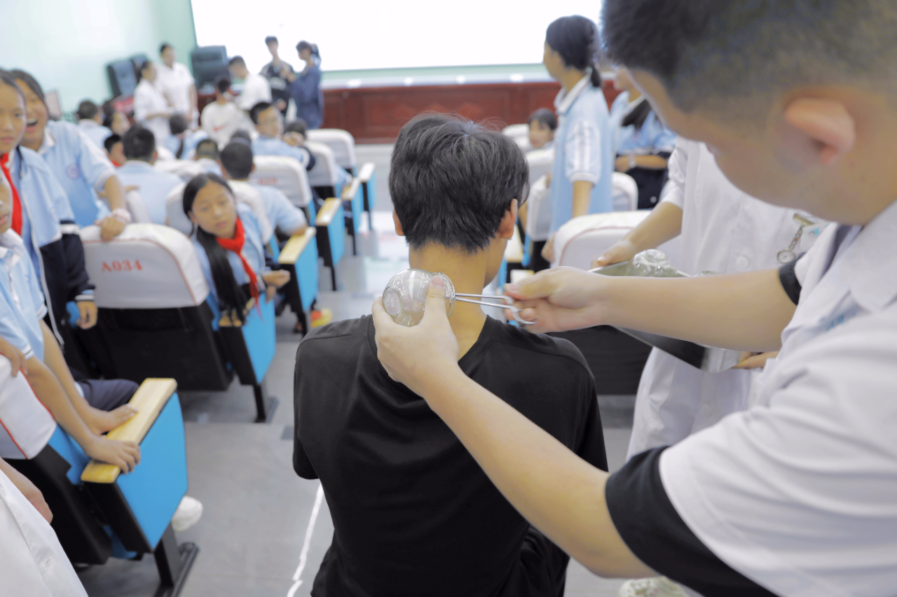 为了让同学们体验中医药的魅力,在专业医护人员的指导下,学生们尝试了拔罐疗法,并现场感受了拔罐带来的舒适与放松。医护人员耐心解答了学生们提出的每一个问题,进一步加深了他们对中医药文化的理解和认同。