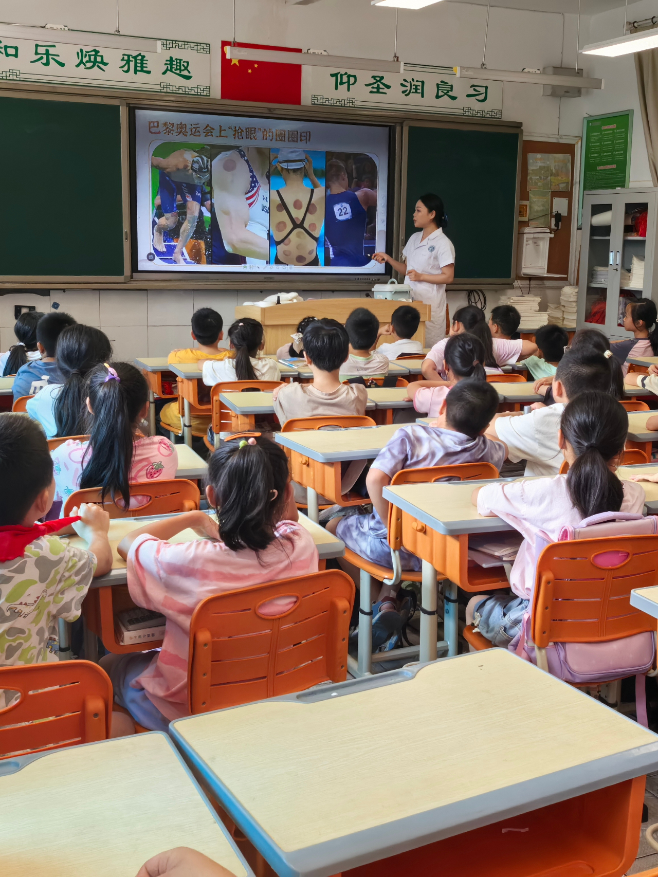 课堂上,中医专科护士李欣珏以巴黎奥运会运动员后背上“神秘的东方力量”为题,通过PPT展示、视频播放、现场演示和互动问答等趣味方式,向学生详细介绍拔罐中医药疗法的历史、作用原理、适应症及人体穴位等医学知识,并现场演示选罐、选穴、拔罐、起罐等操作流程,同时邀请学生亲身体验,零距离感受中医药文化的魅力,培养同学们对中医传统疗法的浓厚兴趣,让古老的中医药智慧在孩子们的心中生根发芽。