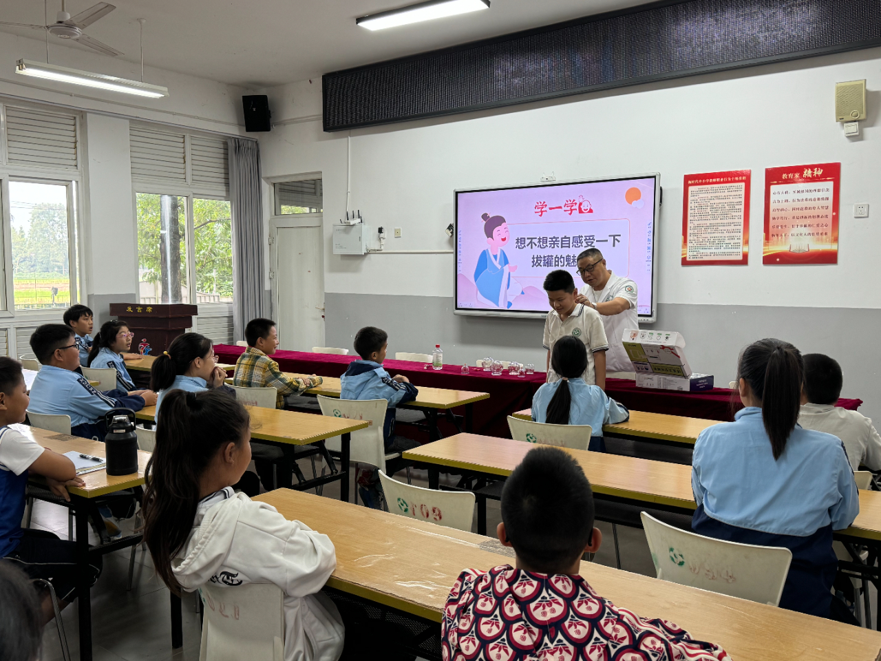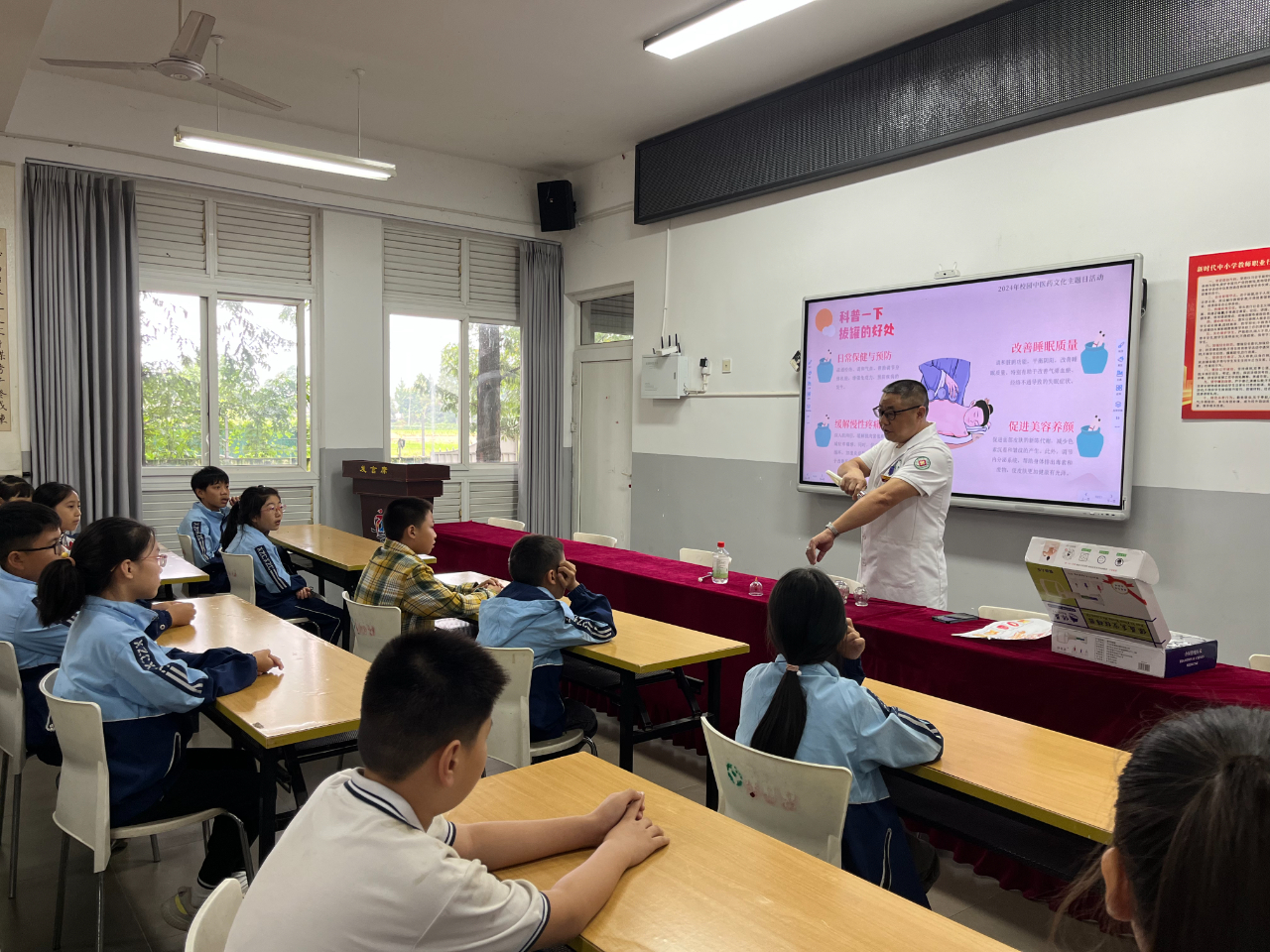互动环节中,黎老师还邀请学生当“模特”,体验拔罐的过程,同学们都踊跃报名,在交流过程中,同学们熟悉了选罐、选穴、拔罐、起罐等操作流程,让他们零距离感受中医文化的魅力,培养同学们对中医药传统文化的浓厚兴趣。活动现场,有不少的同学化身“小郎中”,在中医科老师的指导下饶有兴致地使用真空拔罐器为同学进行拔罐操作,体会拔罐疗法的神奇之处。