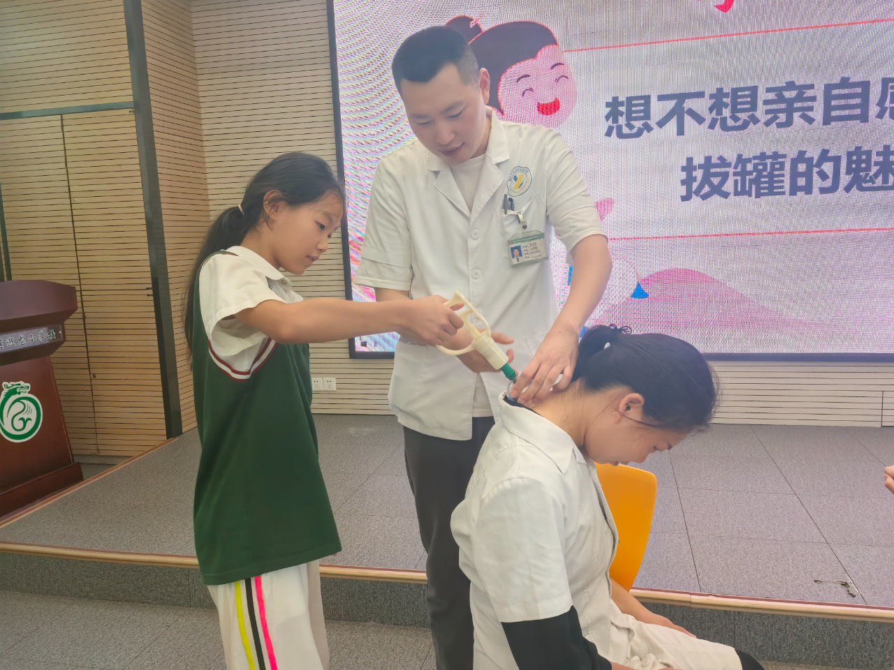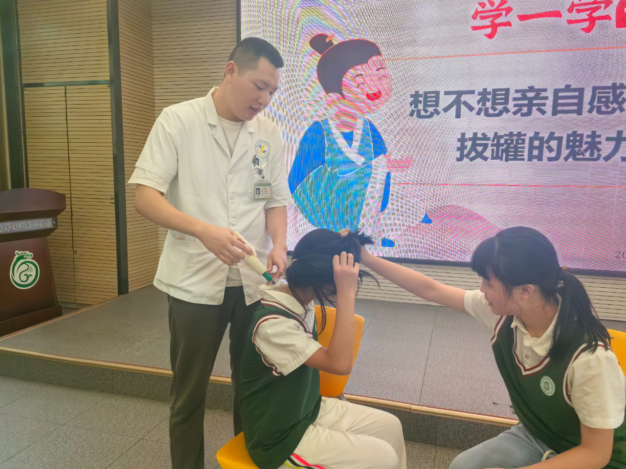 最后,赖医生还带来了拔罐工具,亲身为学生们拔上一罐,还让孩子们亲自操作,让孩子们切身体会到中医药文化的神奇和魅力。