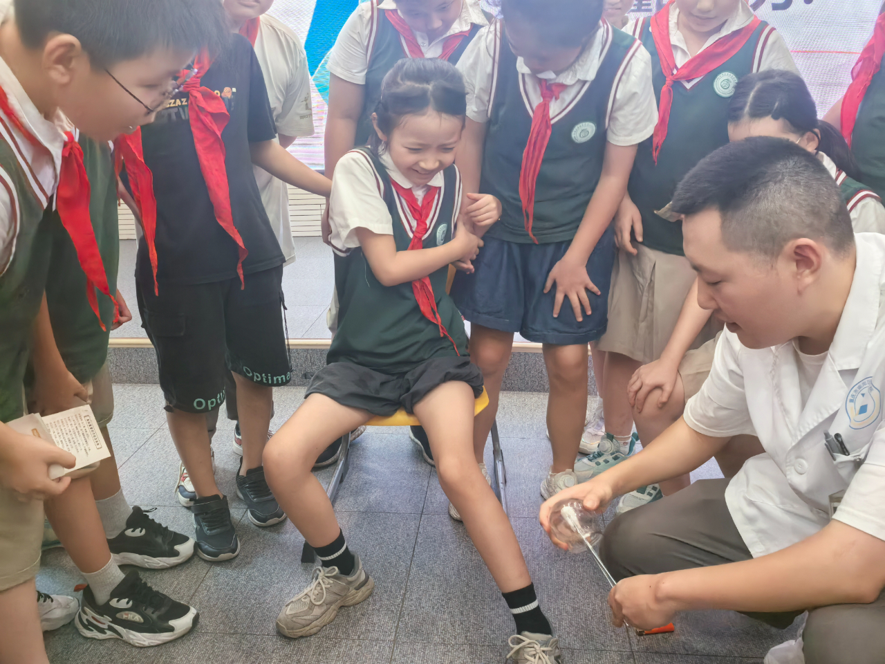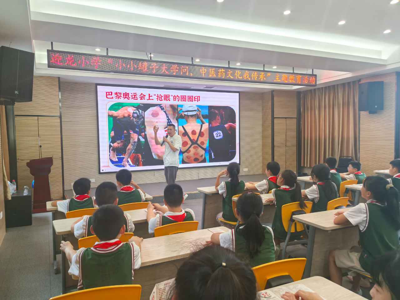 赖医生面对满眼好奇的五年级学生们,先是由刚刚结束的巴黎奥运会运动员背上的火罐印图片展示引出活动主题,接着请同学们分享自己的拔罐体验和对拔罐的认识。在同学们的踊跃发言后,进入活动主题。赖医生给孩子们科普了“什么是拔罐”“拔的是什么”“拔罐的好处”“拔罐注意事项”等等有关中医拔罐的知识。接下来,赖医生播放了国家健康科普专家库专家、首都医科大学附属北京中医医院针灸科孙敬青主任关于拔罐知识的科普视频。