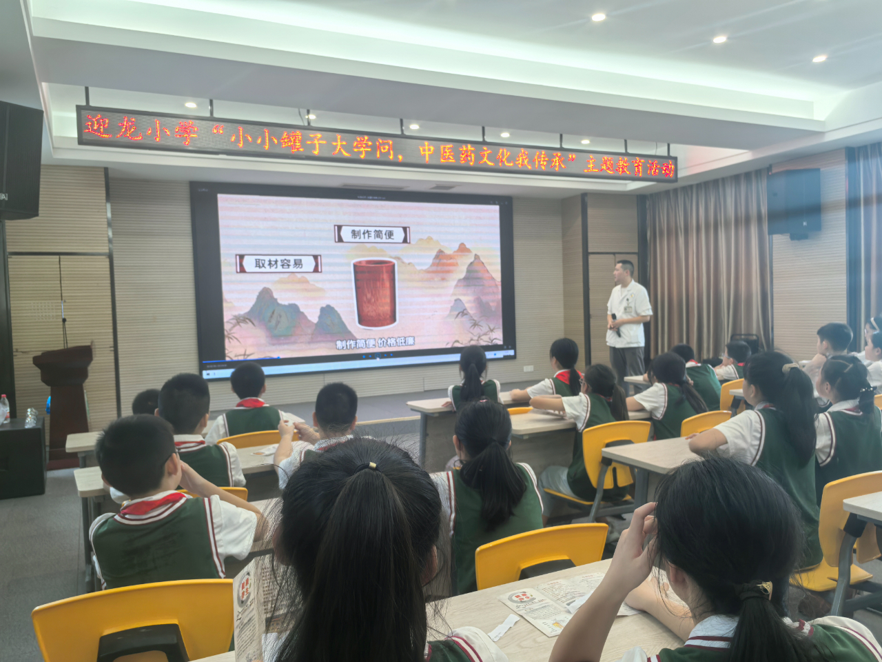 中医药文化源远流长,凝聚着中华民族几千年的健康理念与养生经验。为了进一步弘扬中华民族传统文化,传播中医药文化知识,大力普及健康知识,让更多的学生感受中医药文化的魅力,促进中医药文化的传承与创新发展。迎龙小学是重庆市中医药进校园示范校,2024年9月29日下午,迎龙小学与迎龙镇社区医院携手开展了“小小罐子大学问,中医文化我传承”主题教育活动。此次活动邀请了迎龙镇卫生院中医科主任赖建良走进校园,为同学们带来了一场精彩纷呈的中医药文化盛宴。