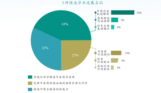 中药全链条产业化研究备受关注,围绕资源、研发、制造、应用等全链条展开的中药产业化研究成为中医药科技工作者的关注重点,相关候选学术进展约占32%。其中,中药资源研究和支撑中药监管科学体系发展的学术进展尤为突出,在该类别进展中占比均超过30%,表明中药资源保障和监管体系建设对推动中药产业化发展具有重要作用。