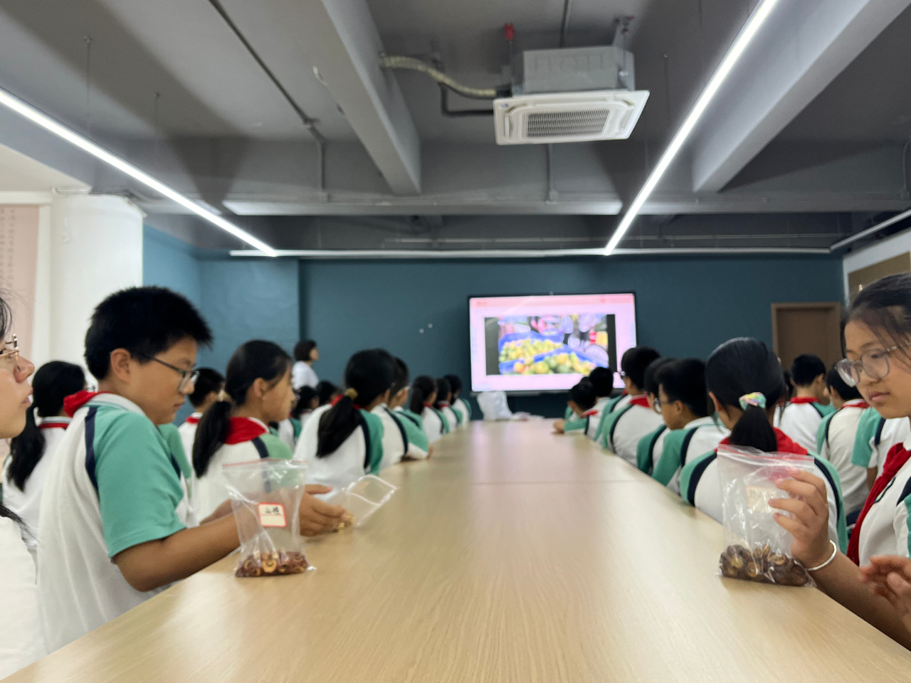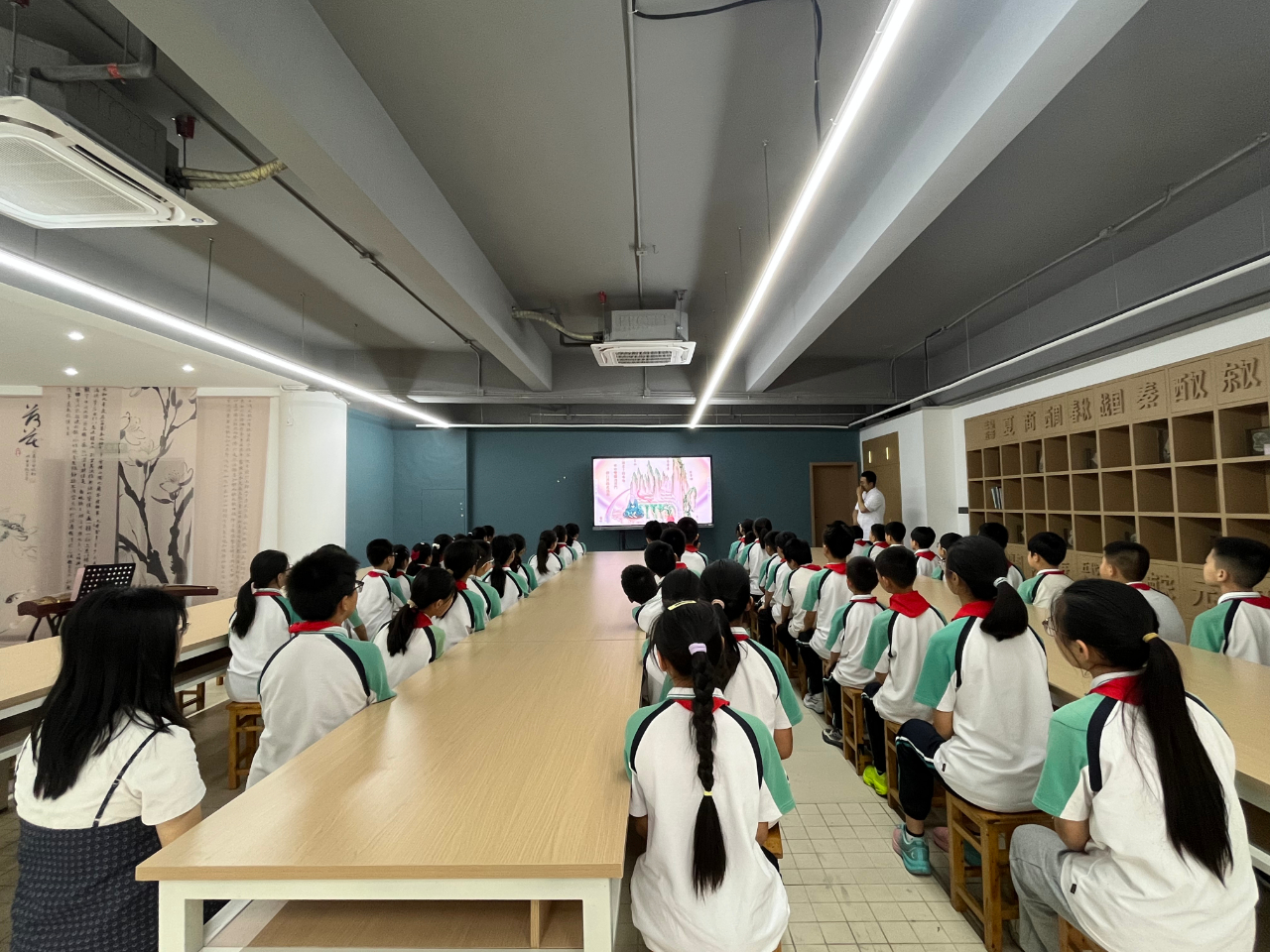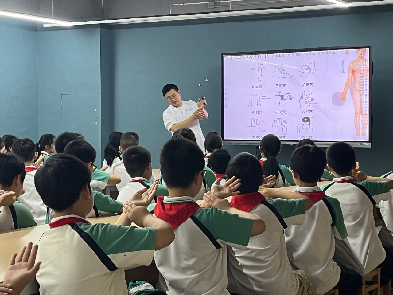 璧山区中医院的授课老师采取课程讲解、现场互动与实物体验的形式介绍了铜人像、《内景图》、木牍等具有代表性的中医药文物。在讲解铜人像时,高清图片与动画视频的展示让同学们更直观了解到其作为古代中医教学和针灸实践重要工具的历史价值;《内景图》的讲解,帮助同学们理解人体脏腑功能,结合五行五脏以及中医五季,让中医药知识更加生活化、形象化。在实物体验环节,老师给学生展示了枸杞、人参、红枣等中医药材,学生通过“看、闻、摸、尝”的方式零距离感受中医药材的神奇魅力。