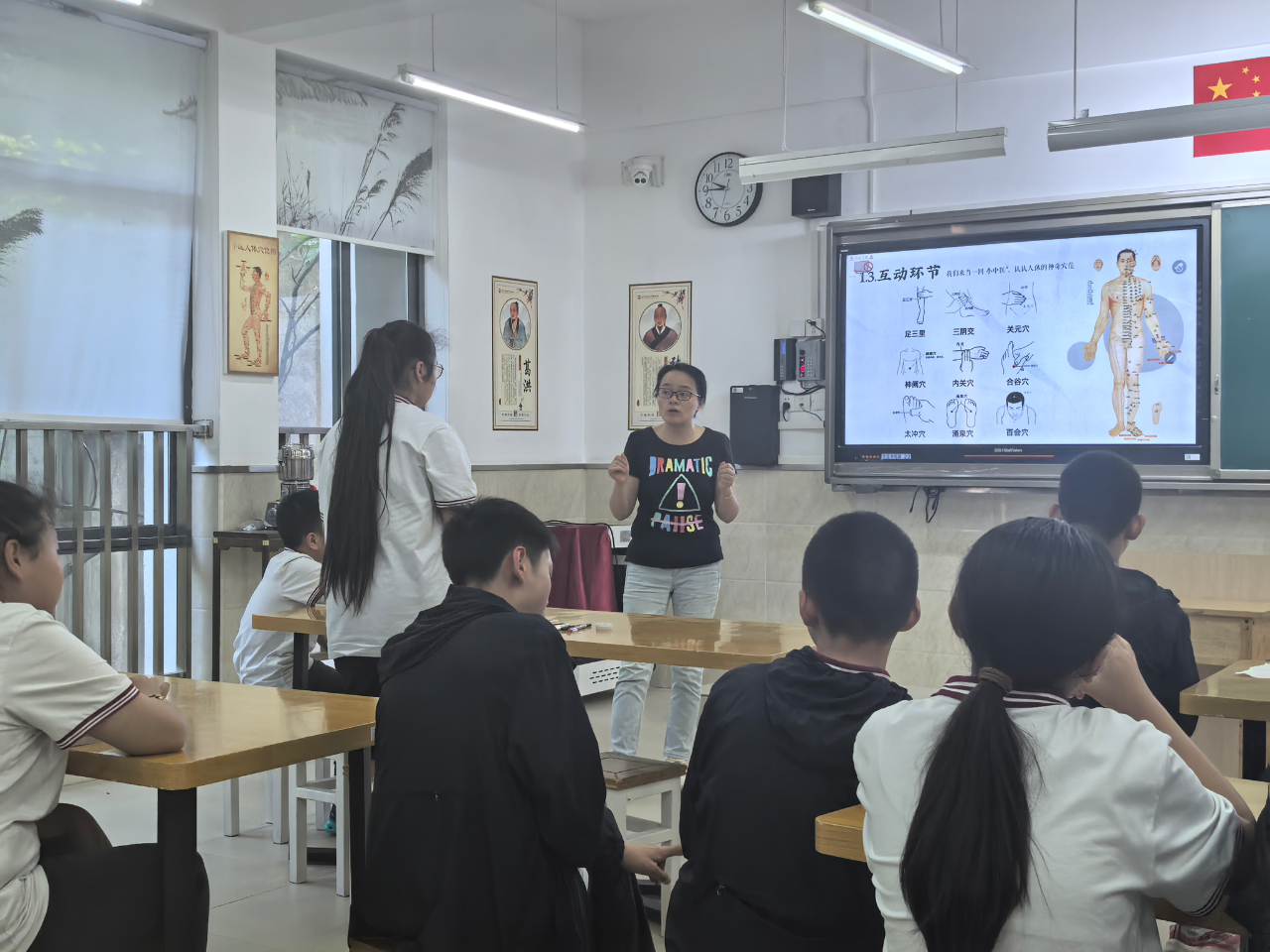 活动现场,来自沙坪坝区中医院的蒋灵副主任医师以针灸铜人“国礼”为切入点,通过展示珍贵照片、组织穴位奥秘讨论并结合短视频揭秘,生动阐释了中医药文化的深厚底蕴与现代价值。在聚焦中国医史博物馆藏《内景图》时,借助专家讲解视频,带领学生穿越时空领略古人对人体奥秘的智慧探索。针对东汉《元延元年历谱》木牍等文物,蒋灵副主任医师深入浅出地讲解文物背后的中医药历史典故,并通过药碾、戥秤等传统器具的图文展示开展互动教学,结合古今器具对比引导学生思考中医药文化的传承路径与创新发展。