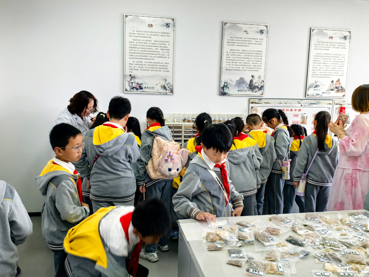 师生们走进医院门诊大厅,参观中药制剂、动物标本及药碾等文物模型展区。在“中药饮片展示区”,学生近距离观察茯苓、人参等药材,聆听讲解员介绍药材来源、功效及炮制工艺,并通过互动问答加深理解。
