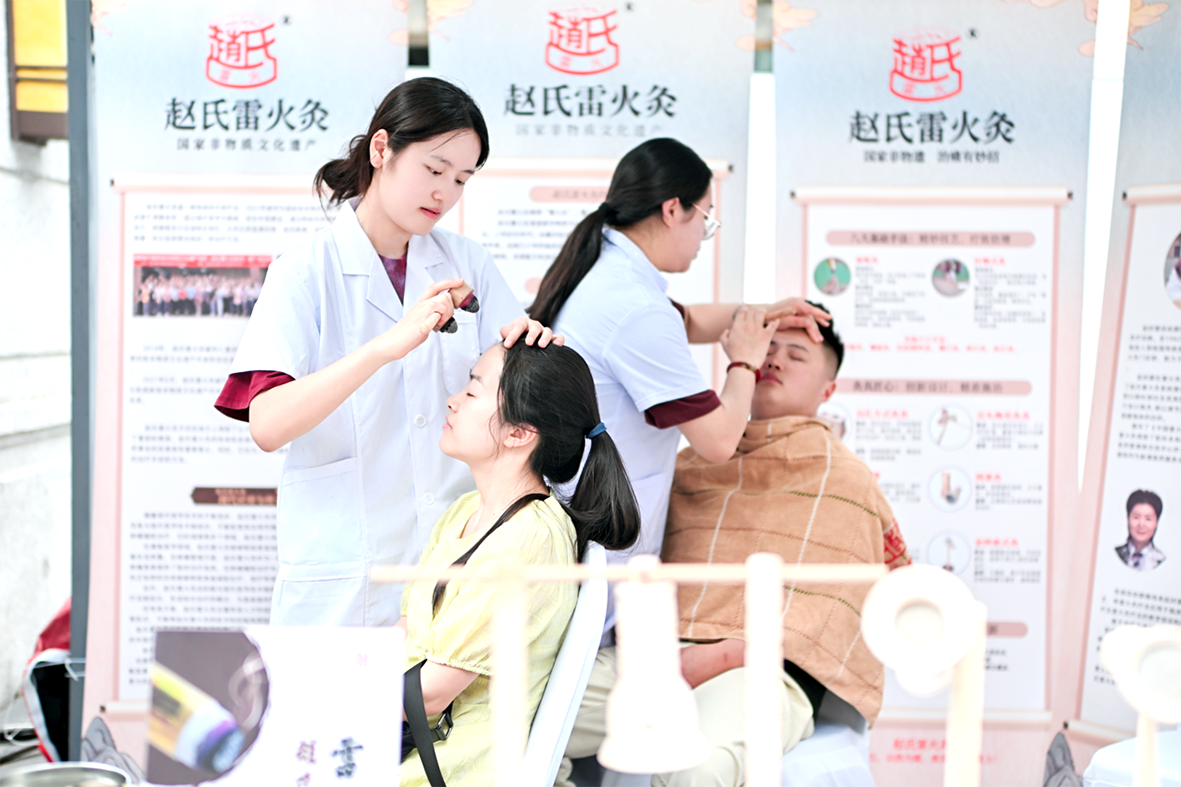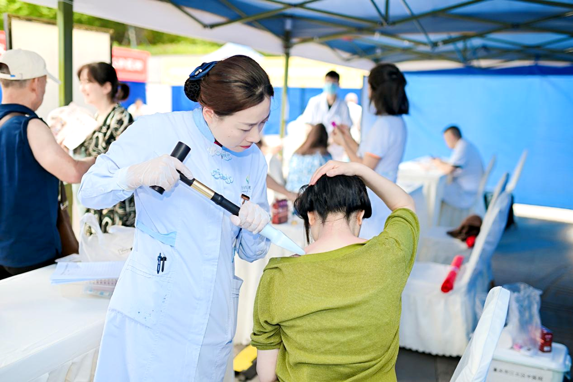 暮色四合,重庆渝中区白象街的青石板路上氤氲开一缕清幽的艾草香。第五批国家级非物质文化遗产代表性项目“赵氏雷火灸”传承人手持特制药艾,针对鼻炎患者精准施灸,热力直透病灶,鼻塞症状立减;荣昌区的市民们体验火龙罐、穴位贴敷、小儿推拿等技术的神奇效果;在南川区,金佛山特色药膳品鉴区免费提供中药糕点、膏方、中药咖啡等养生食品,让市民在享受美食的同时收获健康知识,用舌尖领略“药食同源”的养生智慧……