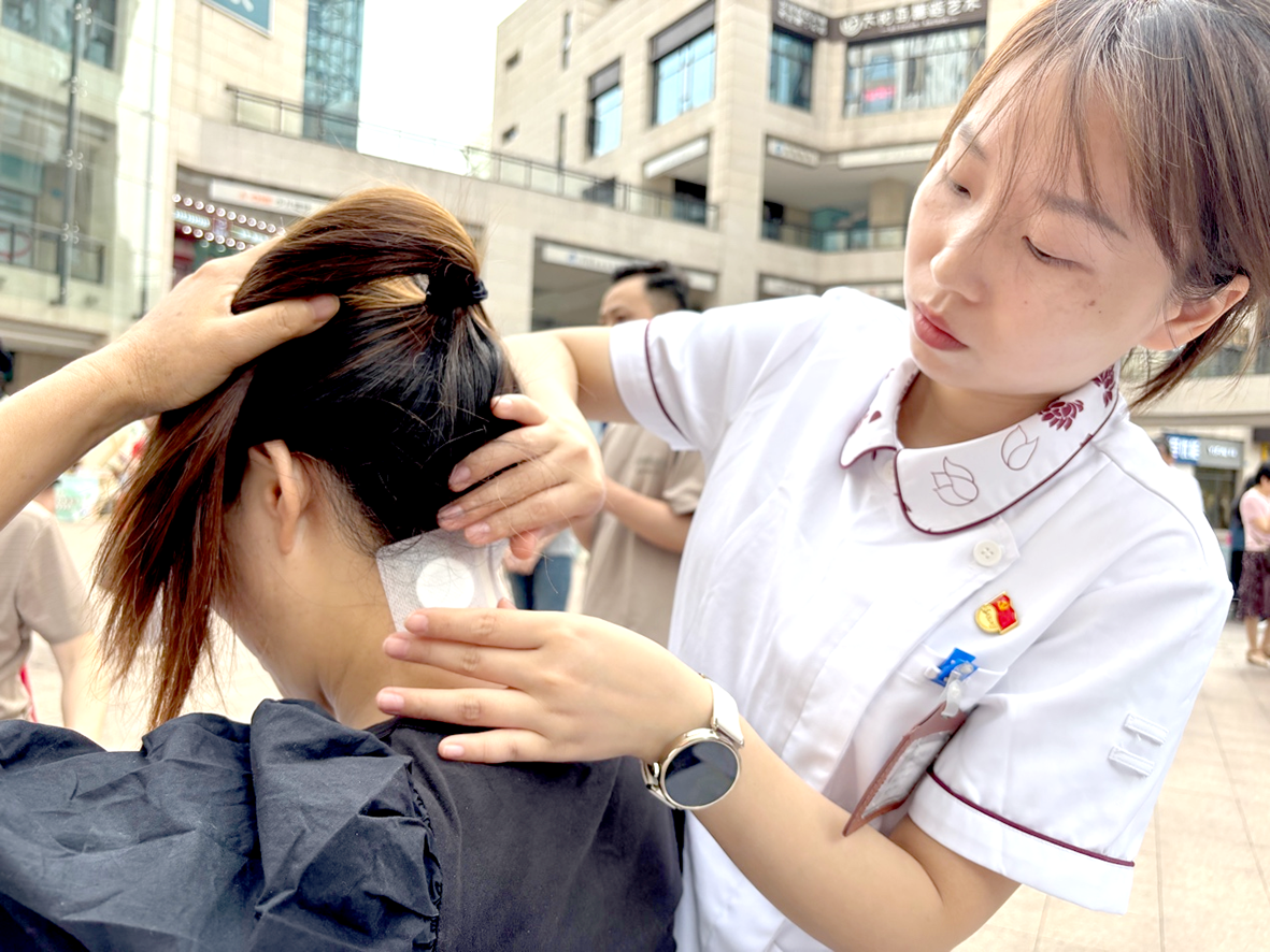 在沙坪坝区,中医服务体验区是夜市的热门打卡点,群众纷纷参与艾灸、耳穴压丸、正骨整脊、眼部雾化等中医特色体验项目。刚体验完艾灸的王女士开心地说:“我湿气比较重,做完艾灸感觉身体轻松了很多。”