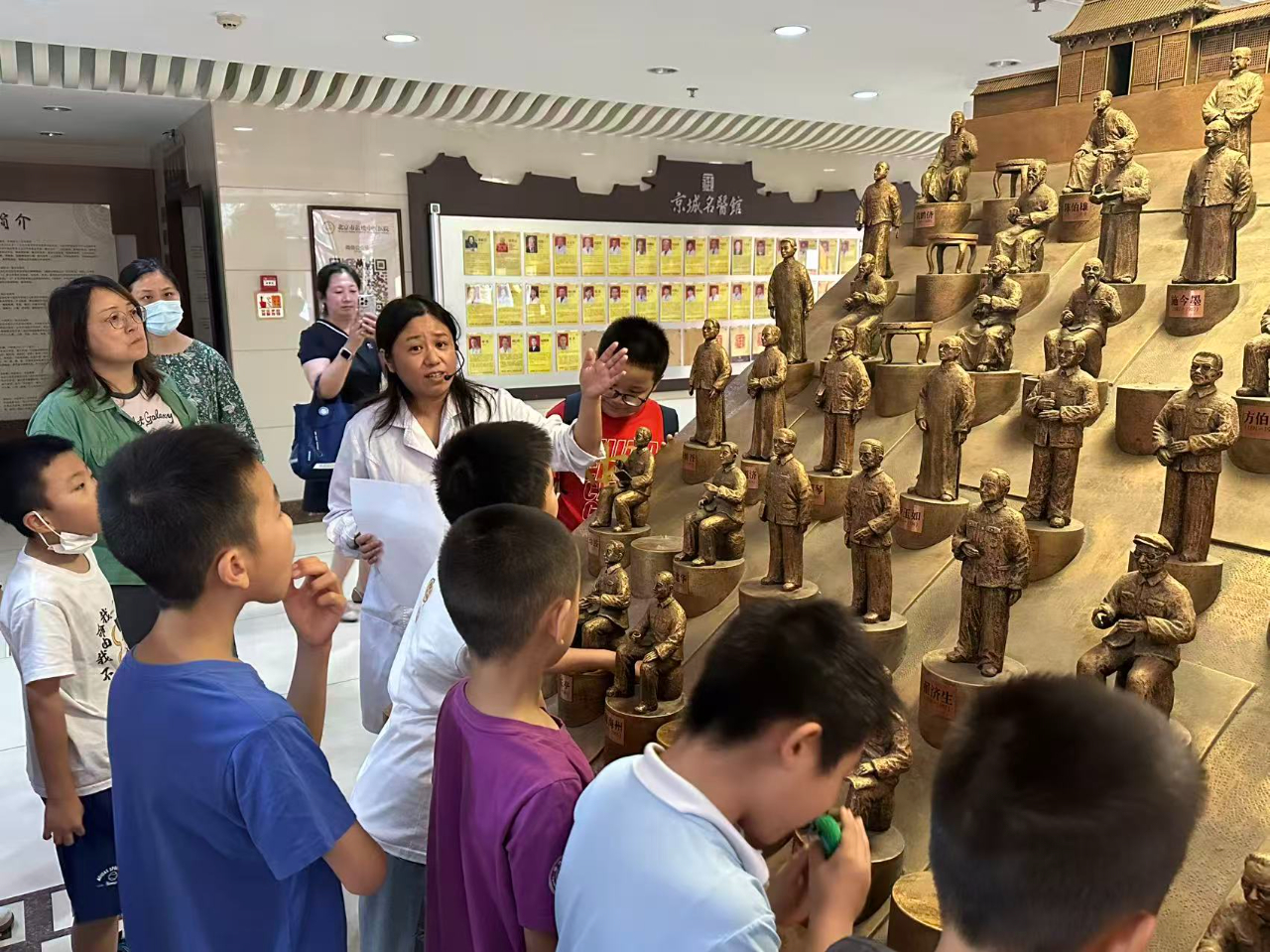 在活动举办之前,工作人员组织大家观看“走进名医故里”宣传片,介绍我国古代名医华佗、李时珍、孙思邈等人的家乡风貌与文化底蕴,让学生初步了解名医故事。正式活动由参观北京市科普基地—京城名医馆开始,工作人员以燕京医学文化发展史为主轴,按照馆内布局依次讲解大医论道、中药饮片燕京八景拼图、鼓楼中医医院文创展品、中医康养吧、五音疗法展示区、院史文化展示区、药食同源墙、金针日晷和药罐编钟模型、名医及历史人物展画等文化集群,重点介绍京城四大名医的生平事迹及贡献,寓教于乐。孩子们兴致极高,与工作人员积极互动,询问中医药历史文化的轶闻典故。