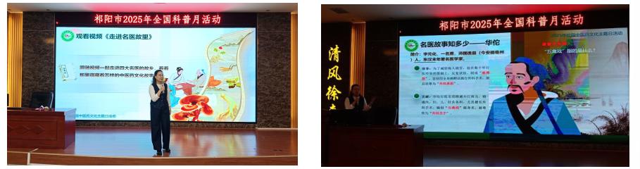 授课环节,祁阳市中医医院文化办主任、湖南省中医药信息研究会科普传播专业委员会副主任委员、永州市健康科普专家库成员董慧为师生们带来了精彩的《名医故里学名医》课程。课程以“名医故里,文化启航”开篇,通过观看《走进名医故里》宣传片,生动展示了华佗、张仲景、李时珍、孙思邈四位古代大医故乡的文化风貌。讲述了“麻沸散”的创制、“饺子”的医源、《本草纲目》的艰辛编纂以及“大医精诚”的医德典范,引导学生们思考名医智慧对现代的深远影响。她还结合本地名医资源,介绍了祁阳本土名中医蒋志诚、肖志文、邓筠等人的事迹,引导学生从身边人、身边事中感受中医药的传承与发展。 在“五脏喜欢的5个动作”互动环节,课堂气氛达到高潮。全体师生们一起练习“拍肘窝”护心、“扇肋”舒肝、“扭腰”健脾、“扩胸”利肺、“踮脚”补肾等简单易学的养生动作,在实践中感受中医养生理念的实用性,现场充满了欢声笑语。
