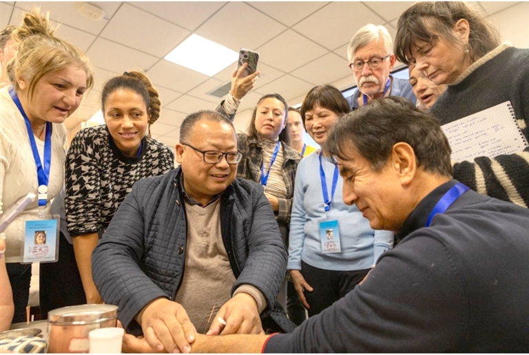 培训紧张而有序地开展,热心肠的卡尔主动担任小组长,每天早早到教室,帮着班主任点名、准备教具。课堂上,他神情专注,跟着老师一遍遍练习“下手八法”“十二字分次第手法”,银针在他手中从生涩渐渐变得平稳。同学们也都专心致志,不仅学针刺,还体验了拔罐、刮痧,辨识中药、调配药膳,早晚还跟着老师练起八段锦与五禽戏。