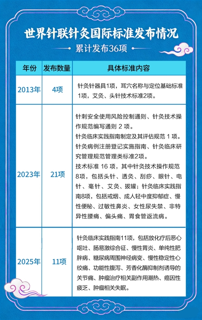 目前,世界针联先后发布针灸国际标准36项,以基础标准、技术标准为主。2013年发布4项针灸国际标准,包括针灸针器具1项,耳穴名称与定位基础标准1项,艾灸、头针技术标准2项。2023年发布21项标准,其中涉及针刺安全使用风险控制通则和针灸技术操作规范编写通则2项;针灸临床实践指南制定及其评估规范1项;技术标准16项(包括针灸技术操作规范8项、针灸临床实践指南8项);针灸病例注册登记实施指南、针灸临床研究管理规范管理类标准2项。2025年发布11项,均为针灸临床实践指南,包括放化疗后恶心呕吐、肠易激综合征、慢性胃炎、单纯性肥胖病、糖尿病周围神经病变、慢性稳定性心绞痛等。(王超 世界针灸学会联合会标准工作委员会)